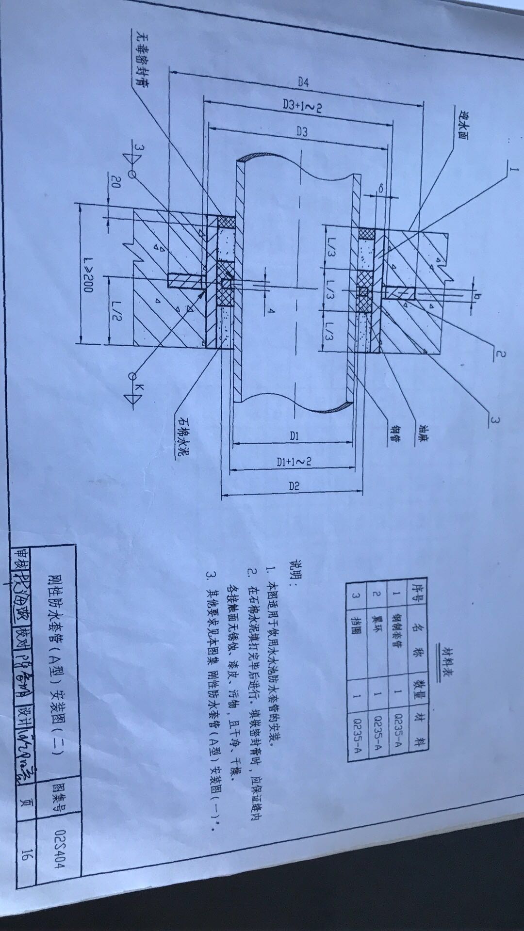 3 、套管尺寸表內(nèi)所列之材料重量為鋼套管(套管長度 L 值按 200mm 計(jì)算)及翼環(huán)之重量。鋼套管及翼環(huán)用 A3 材料制作, T42 焊條焊接。