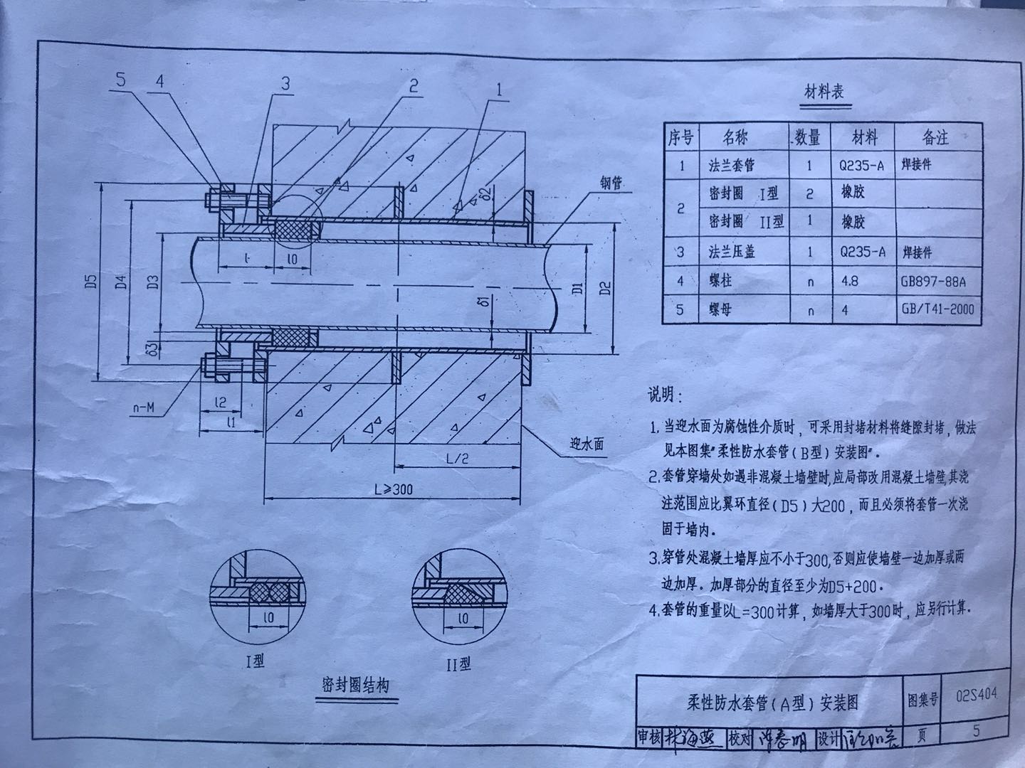 8、柔性防水套管穿墻處如遇非混凝土墻壁時(shí),應(yīng)局部改用混凝土墻壁,其澆筑范圍應(yīng)比翼環(huán)直徑(D5)大200,而且必須將套管一次澆筑于內(nèi)墻。